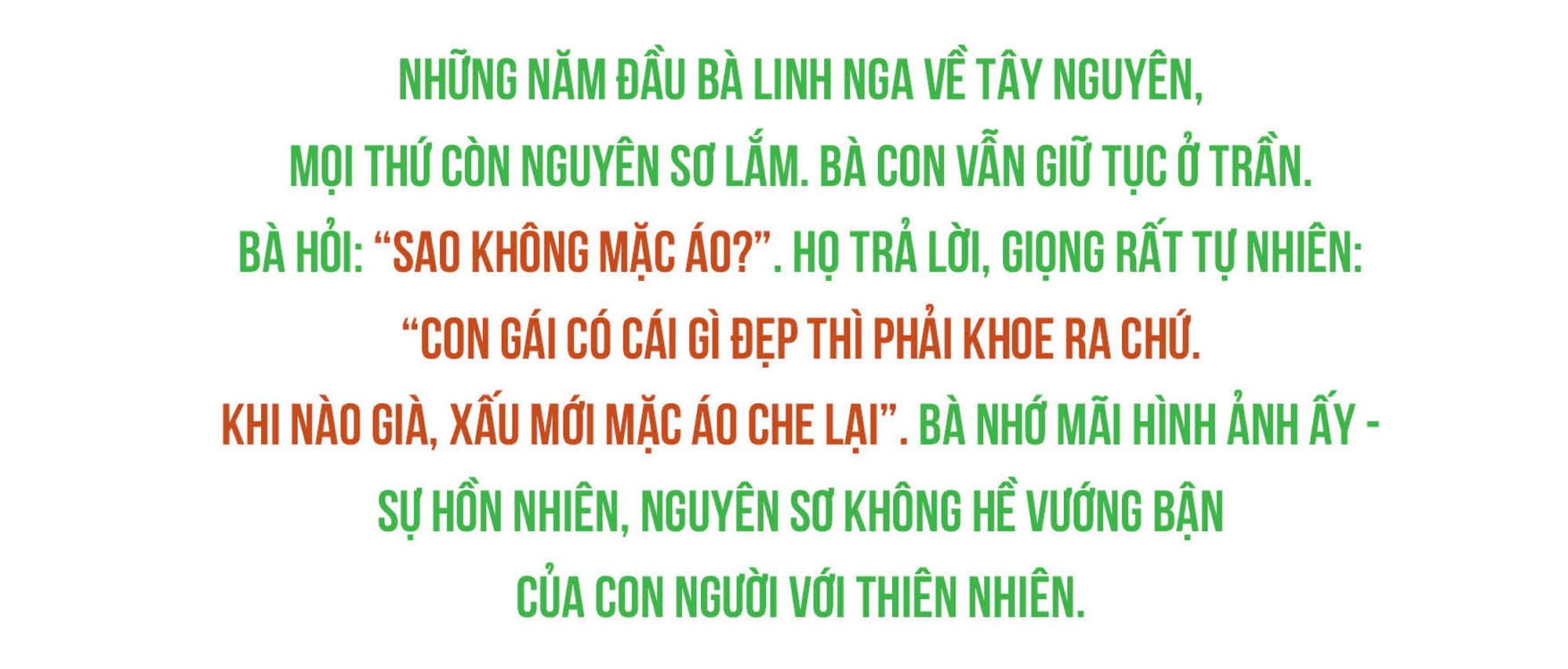 Điều đặc biệt ở bà Linh Nga là sự nhạy cảm đến mức khó tính. Một slogan sai lệch về món ăn Tây Nguyên, một ngôi nhà sàn dựng vội, hay tin một nghệ nhân ra đi - tất cả đều khiến trái tim bà trăn trở. Bà luôn lên tiếng, chỉnh sửa, bảo vệ để hình ảnh Tây Nguyên không bị giản lược, bóp méo hay quên lãng.