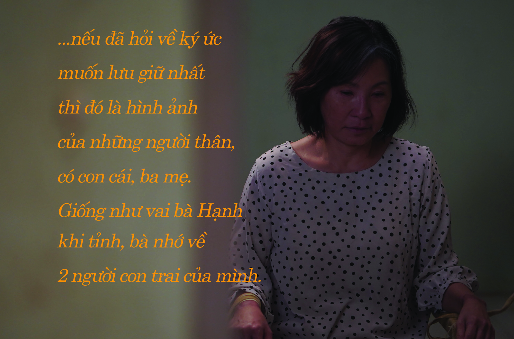 Với tôi, giữ lại kỷ niệm đẹp cũng được, kỷ niệm không đẹp cũng được vì tất cả đều khiến cho cuộc đời của mình “giàu” hơn. Nhưng nếu đã hỏi về ký ức muốn lưu giữ nhất thì đó là hình ảnh của những người thân, có con cái, ba mẹ. Giống như vai bà Hạnh khi tỉnh, bà nhớ về 2 người con trai của mình.