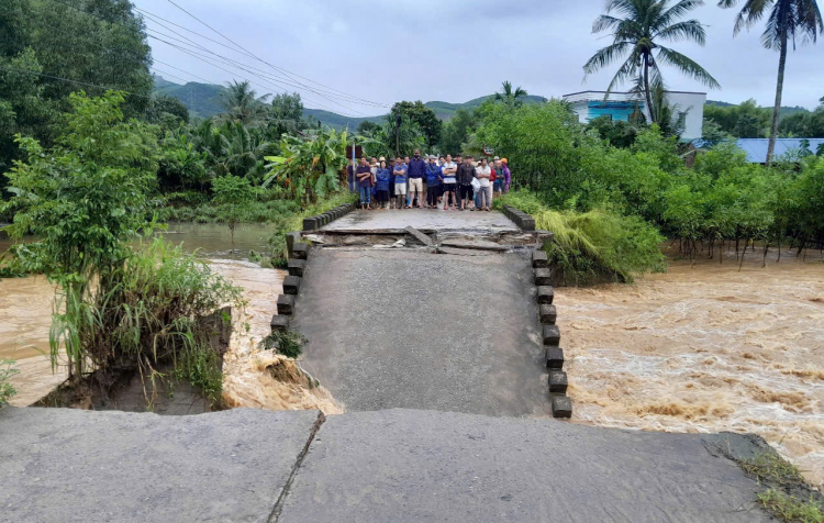 Sáng 2/11, nước lũ tràn về khiến cầu Cây Sung (xã Bình Minh, tỉnh Quảng Ngãi) bị sập, khiến 316 hộ, với 1.280 người bị cô lập.