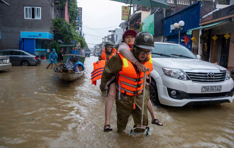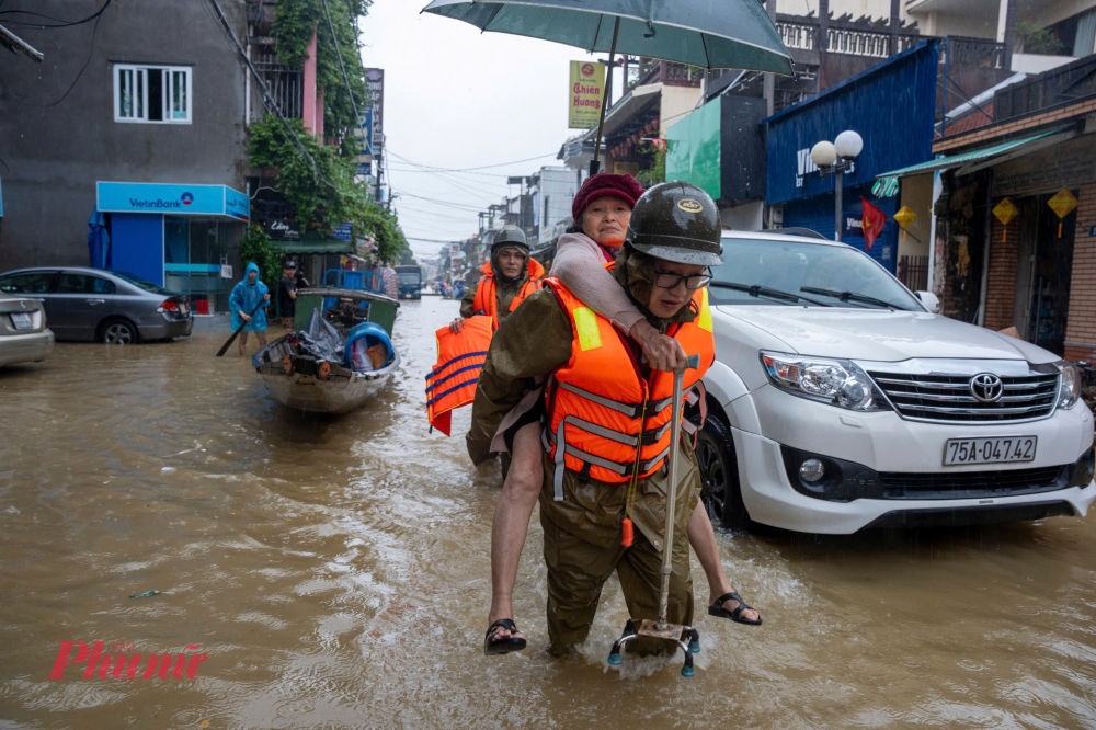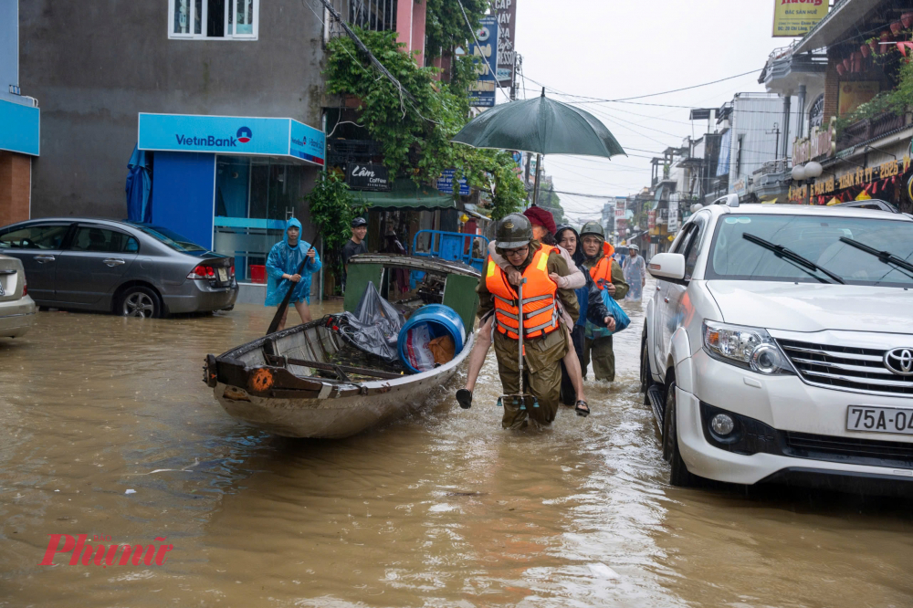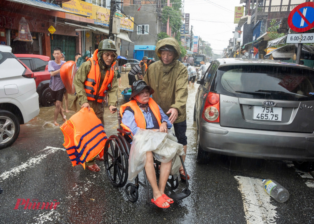Lực lượng vũ trang TP Huế đã triển khai các lực lượng đến hỗ trợ người dân ở các khu vực trũng thấp bị ngập sâu di dời đến nơi an toàn.