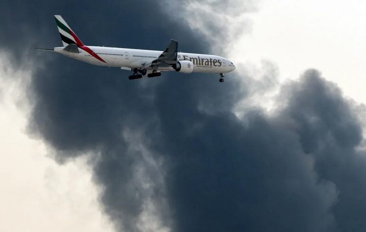 | Máy bay Boeing 777 của Emirates chuẩn bị hạ cánh khi cột khói bốc lên gần Sân bay Quốc tế Dubai, ngày 16/3. Ảnh: Getty Images |