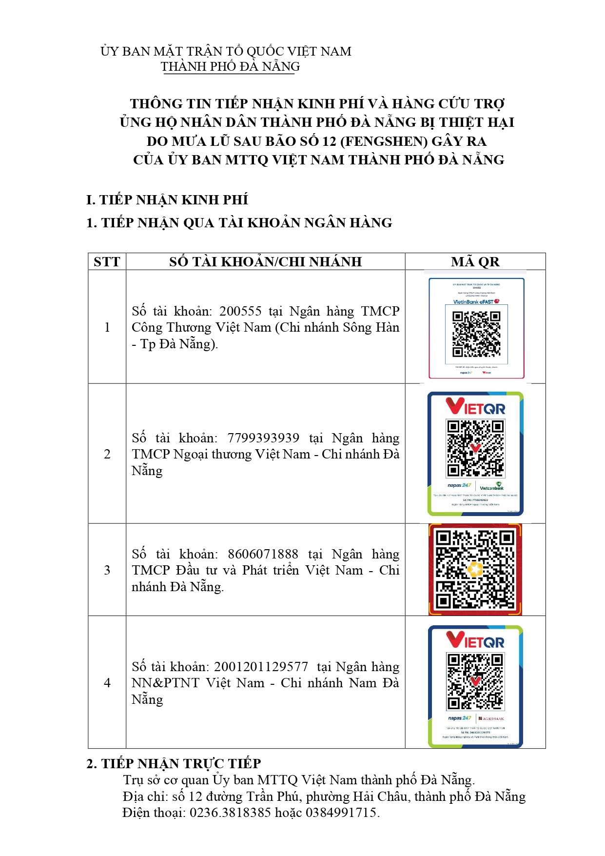 PNO - UB MTTQ Việt Nam TP Đà Nẵng thông báo về việc tiếp nhận tiền và hàng cứu trợ nhân dân thành phố bị thiệt hại do thiên tai sau bão số 12.