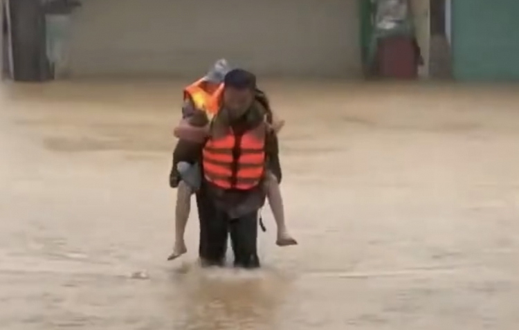 Sáng 3/11, cán bộ Công an phường An Cựu, TP Huế, hỗ trợ các cụ già từ vùng ngập sâu đến nơi an toàn.