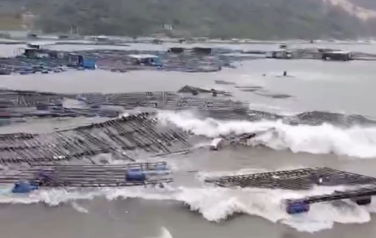Khi bão Kalmaegi đổ bộ vào chiều tối 6/11 tại Gia Lai, gió bão khiến lồng bè bị phá huỷ. Trên đường phố, gió lớn khiến biển quảng cáo bị bóp nát.