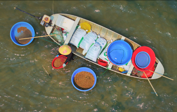 | Tờ mờ sáng, khi thủy triều bắt đầu rút, những chiếc thuyền nhỏ lặng lẽ rời bờ. Dụng cụ mang theo chỉ vỏn vẹn vài chiếc cào sắt tự chế, rổ, can hay thau nhựa buộc dây ngang bụng để làm phao nổi đựng ốc - ảnh: Tuệ Lâm. |