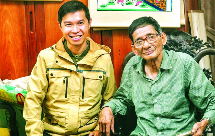 | Ngô Quý Đức và nghệ nhân Lê Đình Nghiên (phải), người duy nhất còn lại nắm giữ những tinh hoa kỹ thuật của dòng tranh Hàng Trống lừng danh |