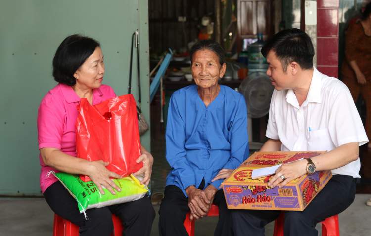 | Bà Nguyễn Thị Kim Hương – Phó bí thư thường trực Đảng ủy phường An Lạc - trao quà tết đến các cụ - Ảnh: Thảo Nguyên |