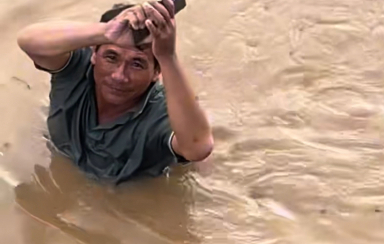 Nước lũ dâng cao khiến nhiều người dân ở xã Hàm Thuận Bắc (tỉnh Lâm Đồng) rơi vào cảnh khó khăn. Họ phải di chuyển liên tục giữa dòng nước lũ ngập đến ngực, gần cổ để sinh hoạt.