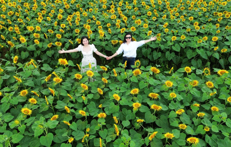 | Vườn có hơn một triệu bông hoa, trong đó hướng dương là chủ đạo, xen kẽ một số loại hoa khác để tăng thêm sắc màu, tạo điểm nhấn cho không gian. |