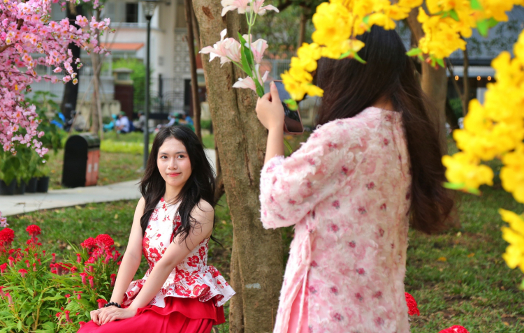 | Nhiều bạn trẻ, gia đình,... đến vui chơi, chụp hình tại vườn hoa. Trong ảnh là hai bạn sinh viên đến vườn hoa với trang phục áo dài để chụp ảnh tết. Cả hai đều bất ngờ thích thú khi biết vườn hoa được cải tạo từ "đất vàng" bị bỏ hoang nhiều năm qua. |