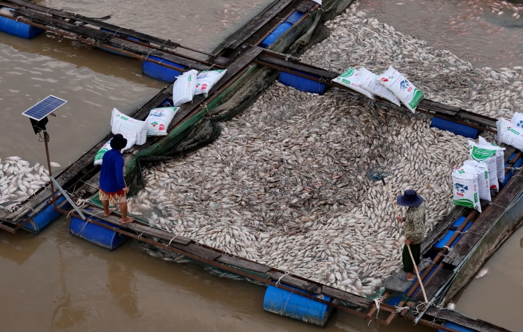 PNO - Do ảnh hưởng của bão số 13 và nước lũ, hàng loạt lồng bè nuôi cá trên sông của người dân bị thiệt hại nặng nề do cá chết hàng loạt.