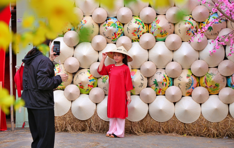 | Nhiều trẻ em thích thú "check in" tại khu vực trang trí nón lá khi được cha mẹ dẫn đi du xuân sớm tại Lễ hội Tết Việt. |