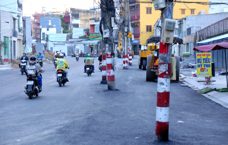 PNO - Đường Chu Văn An đã hoàn thành mở rộng, dự kiến thông xe sau hơn 20 ngày nữa nhưng hàng trụ điện vẫn án ngữ giữa đường, chưa rõ ngày di dời.