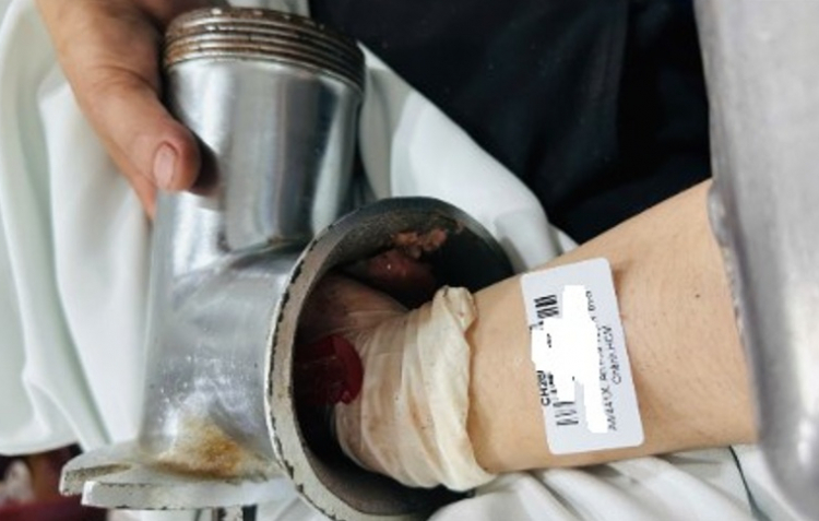 Khoảng 2g sáng 21/4, trong lúc xay thịt, chị N.T.R. (sinh năm 1991) bị mất tập trung nên đưa tay vào máy, không ngờ chiếc máy cuốn trúng găng tay và kéo theo bàn tay, ngón tay chị. Vừa phát hiện, chị được đưa thẳng vào khoa Cấp cứu của Bệnh viện Chấn thương chỉnh hình kèm chiếc máy xay thịt.