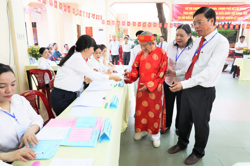 PNO - Trong bộ áo dài đỏ truyền thống nổi bật, nhà nghiên cứu Nguyễn Đình Tư, 106 tuổi, đến khu vực bỏ phiếu số 11 (phường Bình Thạnh, TPHCM) tham gia bầu cử.g Bình Thạnh, TPHCM).