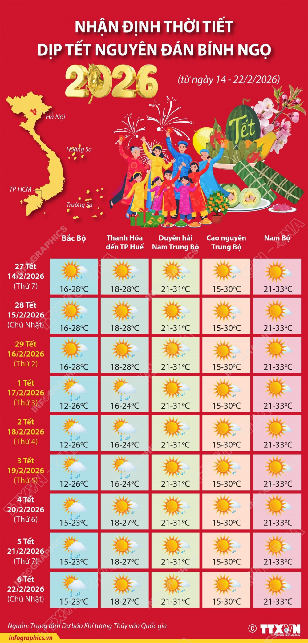 Theo Trung tâm Dự báo Khí tượng Thủy văn Quốc gia, dự báo thời tiết cả nước dịp tết Bính Ngọ 2026 khá thuận lợi để người dân và du khách mua sắm, du xuân.