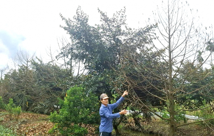 Vườn sầu riêng của người dân xã Nhơn Ái, TP Cần Thơ bắt đầu rụng lá và chết dần do bị ngập lũ vừa qua