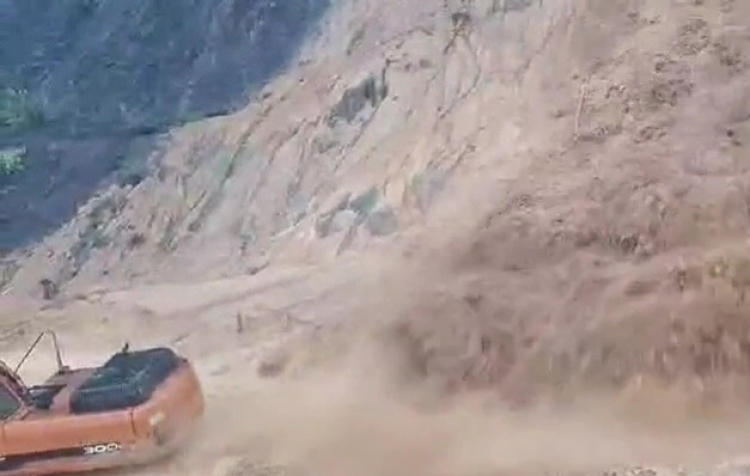 Một chiếc máy múc đang san gạt sạt lở thông tuyến trên QL40B đoạn qua xã Trà Tân (TP Đà Nẵng) thì bất ngờ ngọn núi phía trên tiếp tục sạt lở kéo theo hàng tấn đất đá tràn xuống. Rất may, chiếc xe múc đã rời khỏi vị trí núi sạt trước đó nên người và xe may mắn thoát nạn.