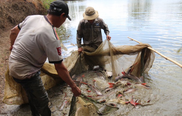 | Người dân thu hoạch cá lăng đuôi đỏ để bán vào dịp tết |
