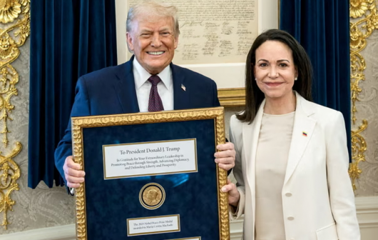 PNO - Tổng thống Mỹ Donald Trump ca ngợi nhà lãnh đạo phe đối lập Venezuela María Corina Machado vì bà trao tặng huy chương giải Nobel Hòa bình 2025 cho ông.