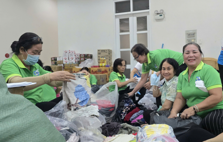 PNO - Ngày 23/11, tại trụ sở cơ quan Hội LHPN TPHCM, chị em cán bộ hội viên phụ nữ đã có mặt từ sáng sớm phân loại, sắp xếp quần áo, hàng hóa, nhu yếu phẩm thành các túi quà để gửi đến đồng bào các tỉnh miền Trung bị ảnh hưởng bởi bão lũ.