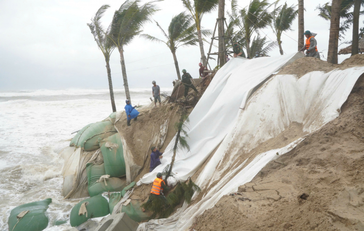 PNO - Lực lượng quân đội đã huy động nhân lực và máy móc gấp rút gia cố sạt lở ở bờ biển Hội An Đông (Đà Nẵng).