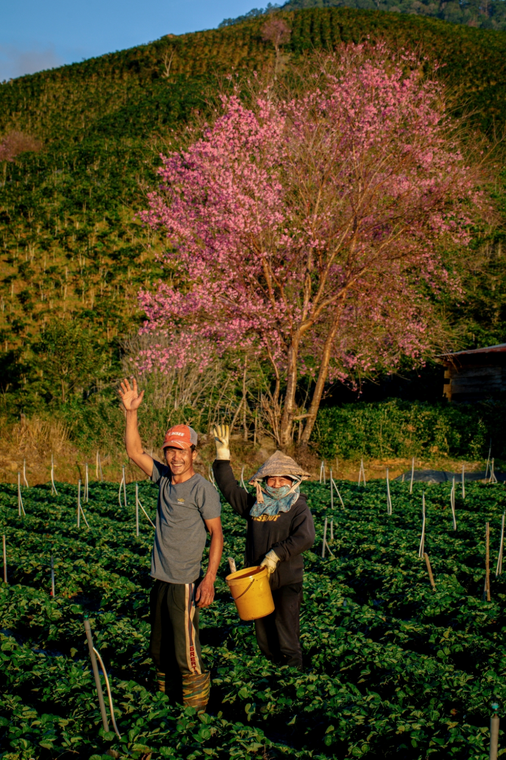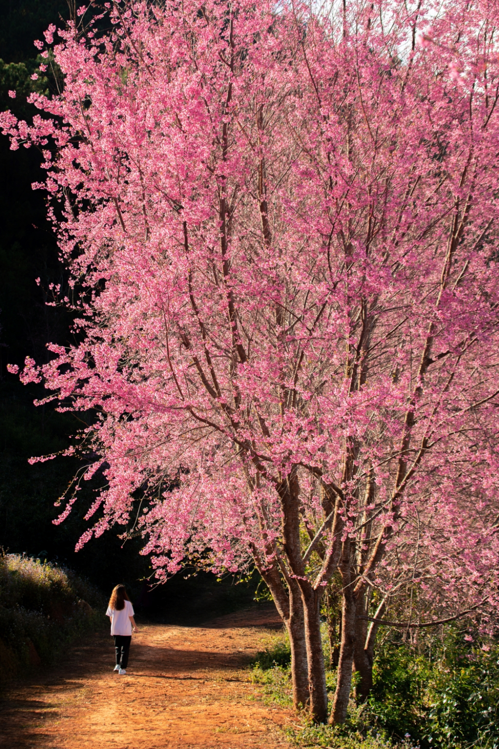 Không phải những hàng cây được trồng thẳng tắp hay các tiểu cảnh sắp đặt, mai anh đào ở Mộng Đào Nguyên nở theo cách rất “hoang dã”. Cây mọc xen giữa thông, cà phê và đá bazan, vươn mình trong gió lạnh đầu năm, phủ kín triền đồi bằng một lớp hồng phai dịu dàng.