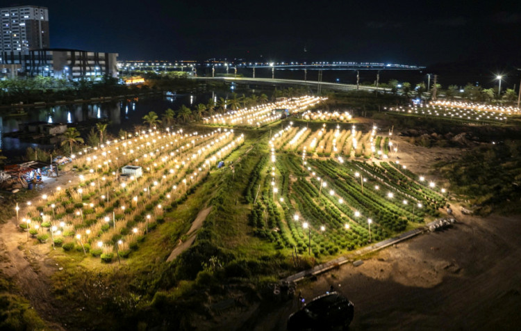 Ở vùng trồng hoa cúc bên sông Hà Thanh, phường Quy Nhơn, tỉnh Gia Lai, nông dân cũng đang tất bật trồng hoa tết, đèn điện sáng trưng mỗi đêm. Nhìn từ trên cao, cả cánh đồng lấp lánh ánh đèn. |