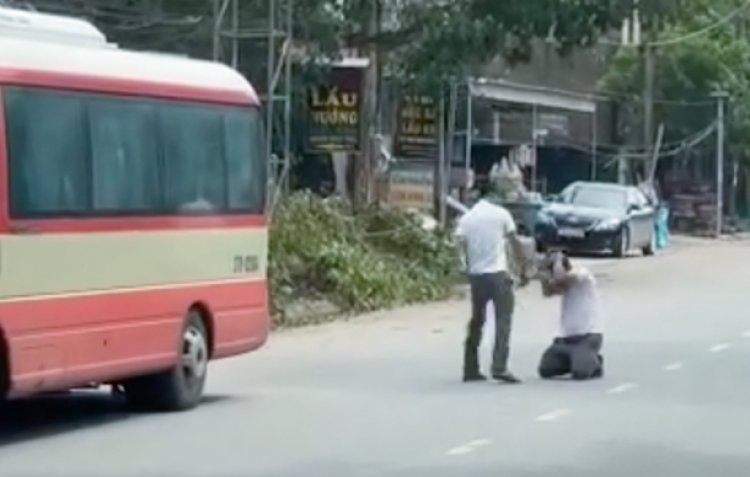 PNO - Mâu thuẫn trong quá trình vận chuyển hàng hóa, Hòa ép nam tài xế xe buýt quỳ giữa đường xin lỗi, rồi dùng thắt lưng và dép đánh vào người anh này.