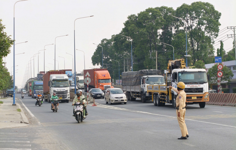 PNO - Chiều 8/4, Đội CSGT CSGT Rạch Chiếc, Phòng CSGT Công an TPHCM phối hợp với Công an phường Dĩ An đã triển khai kế hoạch kiểm tra, tuyên truyền và xử lý các trường hợp xe máy đi vào đường cấm trên cầu vượt ngã tư 550.