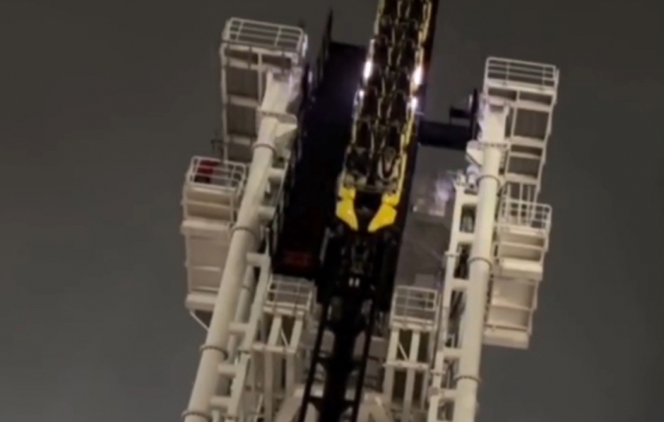 2 nam hành khách mắc kẹt trên tàu lượn cao tốc gặp trục trặc tại một công viên giải trí ở Texas, Mỹ. Tình huống nguy hiểm khi tàu vuông góc, cách mặt đất khoảng 40 mét.