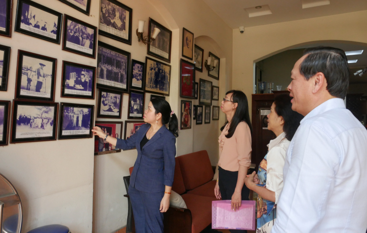| Bà Nguyễn Thị Ngọc Xuân cùng thành viên Đoàn công tác và gia đình nhìn lại hình ảnh, cuộc đời cụ Cao Triều Phát. Cụ được Chủ tịch Tôn Đức Thắng đánh giá cao về công lao đối với sự nghiệp đại đoàn kết dân tộc. |