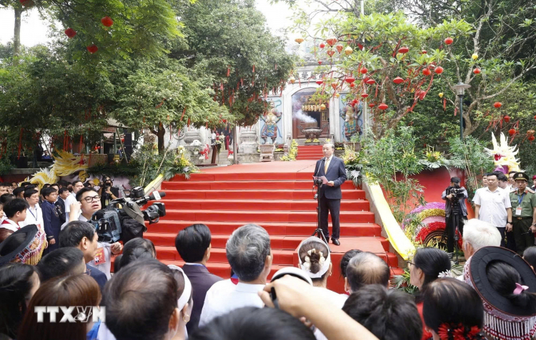 | Tổng Bí thư, Chủ tịch nước Tô Lâm nói chuyện với các tầng lớp nhân dân tại Khu di tích lịch sử Quốc gia Đặc biệt Đền Hùng - Ảnh: TTXVN |