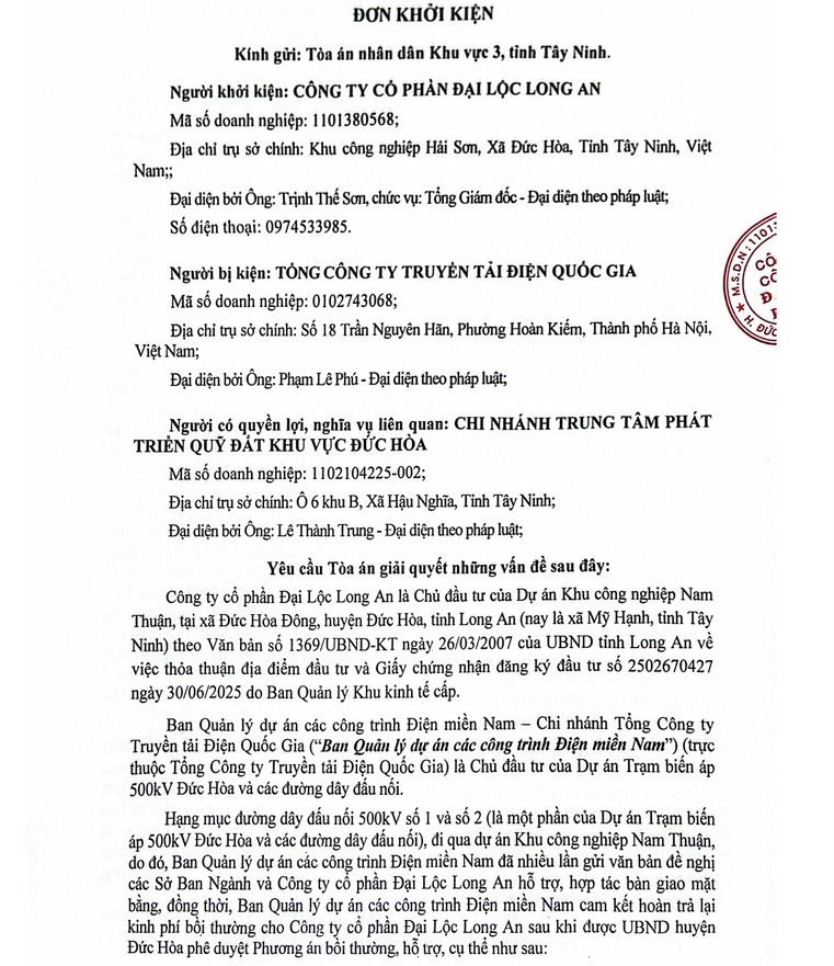 PNO - Sau nhiều lần kiến nghị không được giải quyết dứt điểm, một doanh nghiệp tại Tây Ninh đã khởi kiện Tổng Công ty truyền tải điện quốc gia, yêu cầu hoàn trả gần 20 tỷ đồng chi phí giải phóng mặt bằng đã ứng trước cho dự án.