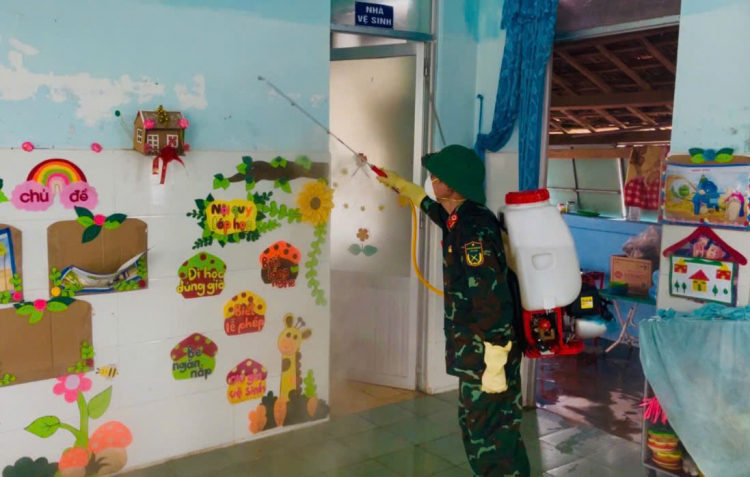 PNO - Lực lượng Quân khu 5 tập trung vệ sinh môi trường, phun khử khuẩn các khu dân cư và công trình công cộng để phòng ngừa dịch bệnh sau lũ.