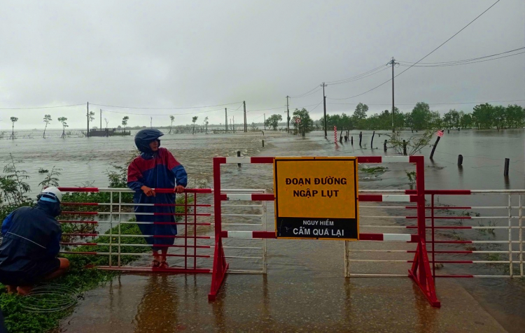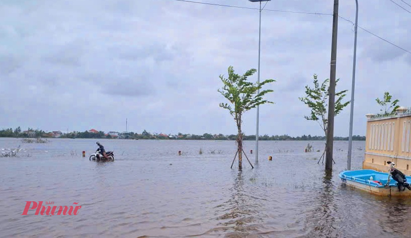 PNO - Sáng 21/10 nhiều khu vực thấp trũng hạ lưu sông Bồ đoạn qua xã Quảng Điền, phường Hóa Châu (TP Huế) nước sông tràn lên đường từ 20 đến 40 cm.