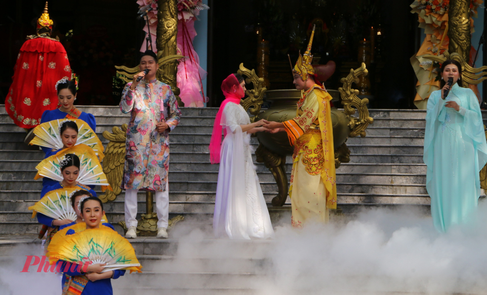 | Du khách xúc động với hoạt cảnh công chúa Huyền Trân (diễn viên vào vai) chia tay cha mẹ, người yêu để lên kiệu hoa vào Chiêm Thành làm vợ vua Chế Mân, mang về cho Đại Việt một vùng đất Châu Ô, Châu Lý rộng ngàn dặm. |