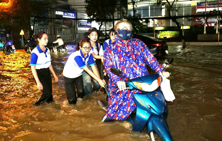 | Các nữ sinh viên ở TP Cần Thơ hỗ trợ người dân đi lại do bị ngập sâu bởi triều cường |