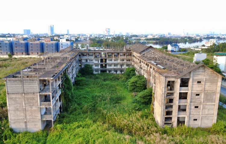 | Các khối nhà bê tông xây dựng dang dở cũng không tránh khỏi sự tàn phá của thời gian. |