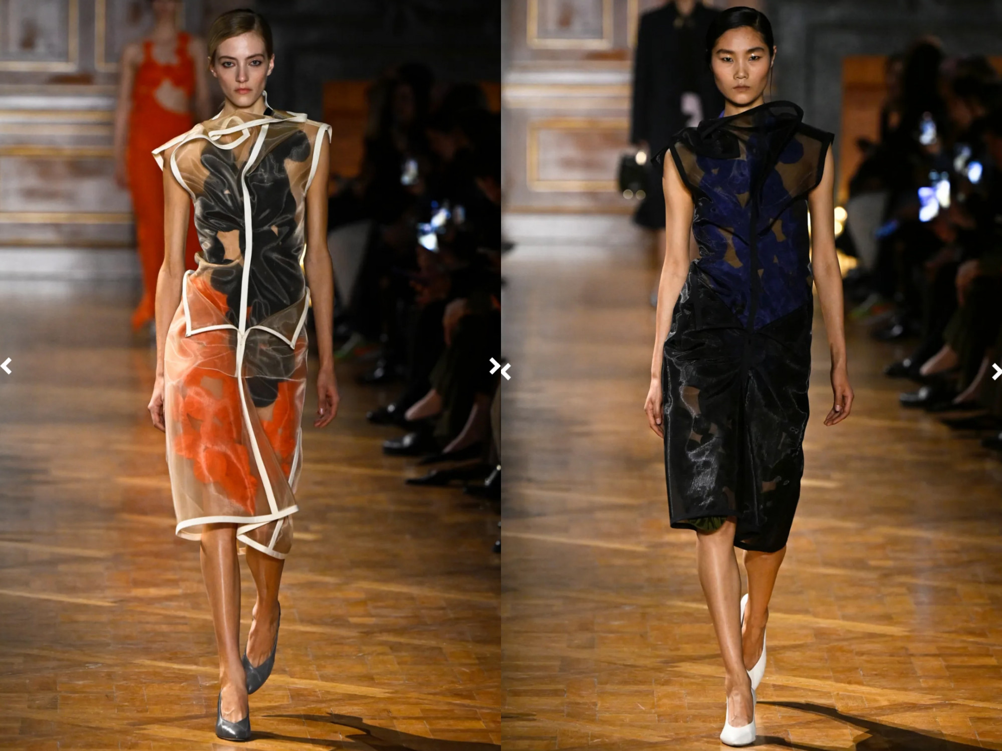 Những chiếc váy này thường kết hợp giữa chất liệu sheer xuyên thấu và phom dáng tối giản, giúp tôn lên đường nét cơ thể mà vẫn giữ được sự tinh tế. Bộ sưu tập còn gây chú ý với các áo khoác oversized, được phối cùng chân váy sheer hoặc quần slim, tạo nên sự đối lập thú vị giữa cấu trúc cứng và chất liệu mềm.
