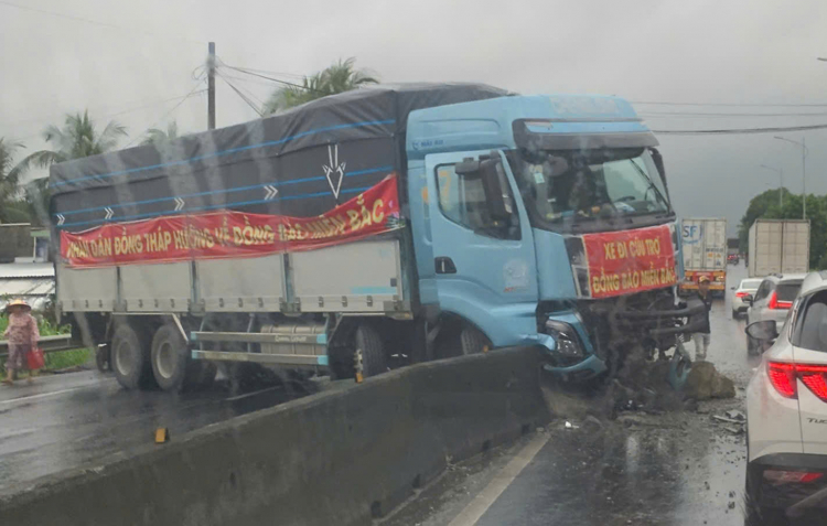 PNO - Trên đường đi cứu trợ miền Bắc, một chiếc xe tải đã gặp nạn, tự va vào dải phân cách giữa đường.