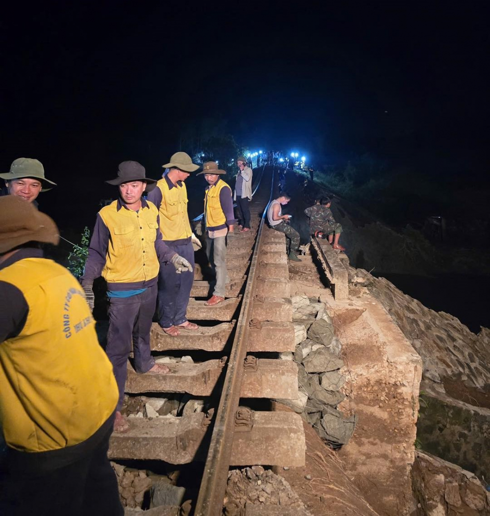 PNO - Các công nhân làm việc “3 ca 4 kíp” xuyên đêm để nhanh chóng nối lại tuyến đường sắt Bắc Nam bị sạt lở đoạn qua Bình Định và Phú Yên – trước đây.